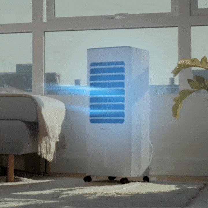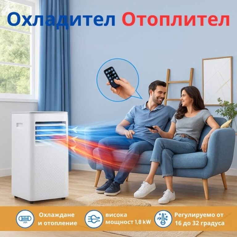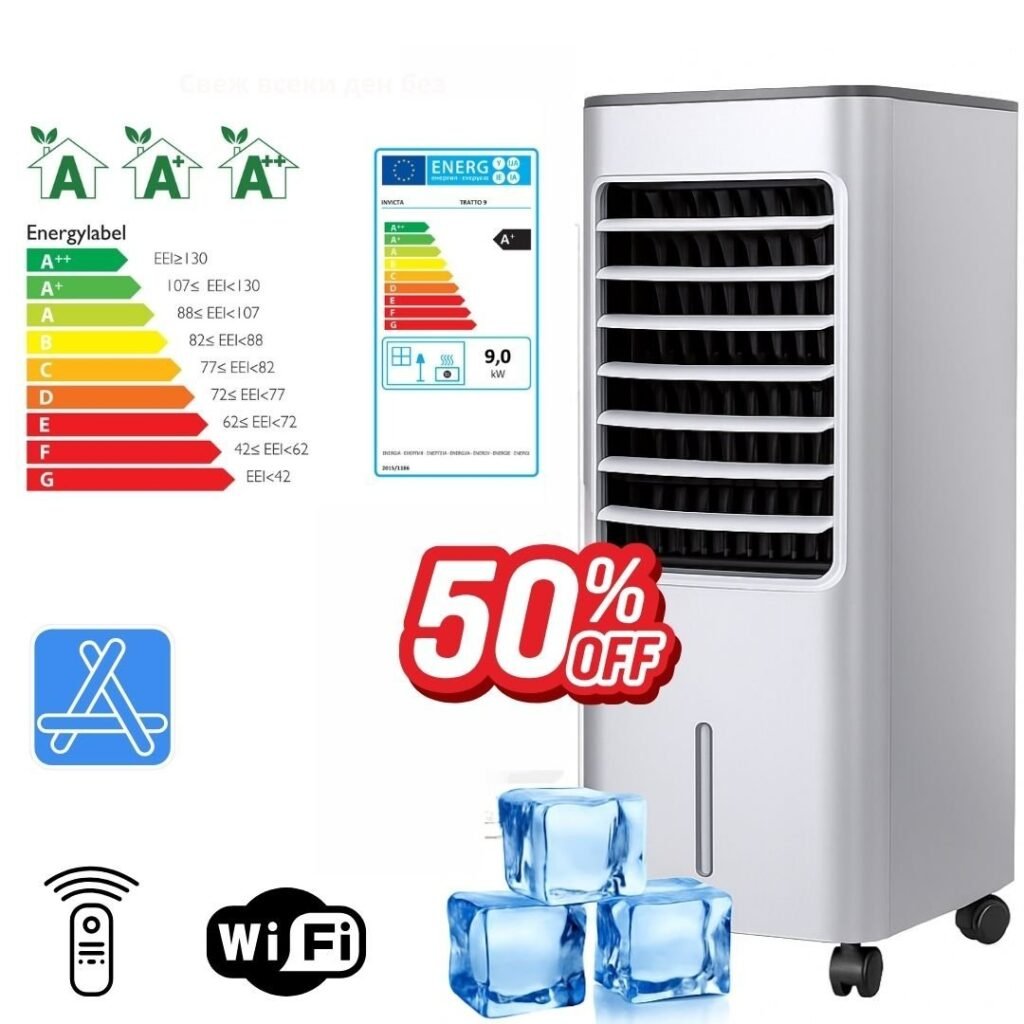 Преносим без тръба за отводняване с подвижен и миещ се HEPA антиалергенен филтър с функции климатик, обезвлажнител, вентилатор и пречиствател на въздуха в едно устройство оборудван със интелигентен температурен сензор и нощен режим за икономия до 90 % от разходите и управление през Wi-Fi с мобилно приложение