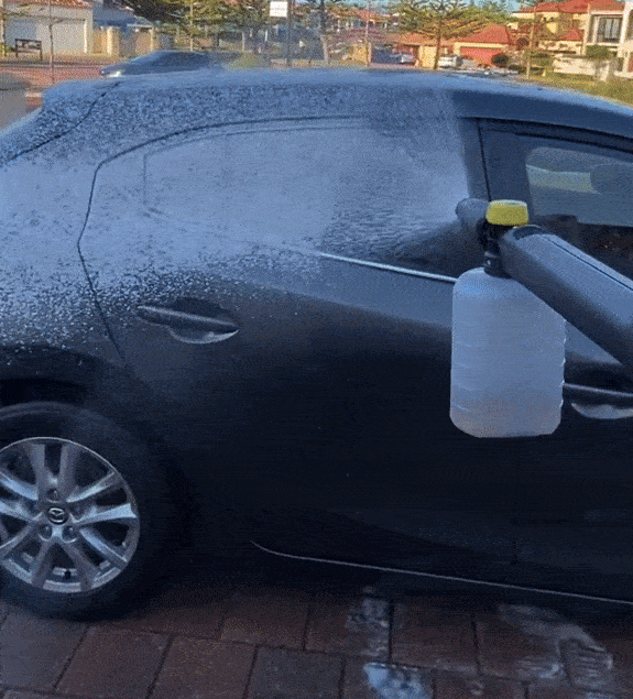 L’ugello per schiuma arricchisce lo shampoo per auto, trasformandolo in schiuma densa che pulisce efficacemente e delicatamente superfici sensibili come vernice e vetri, proteggendo i materiali mentre rimuove lo sporco