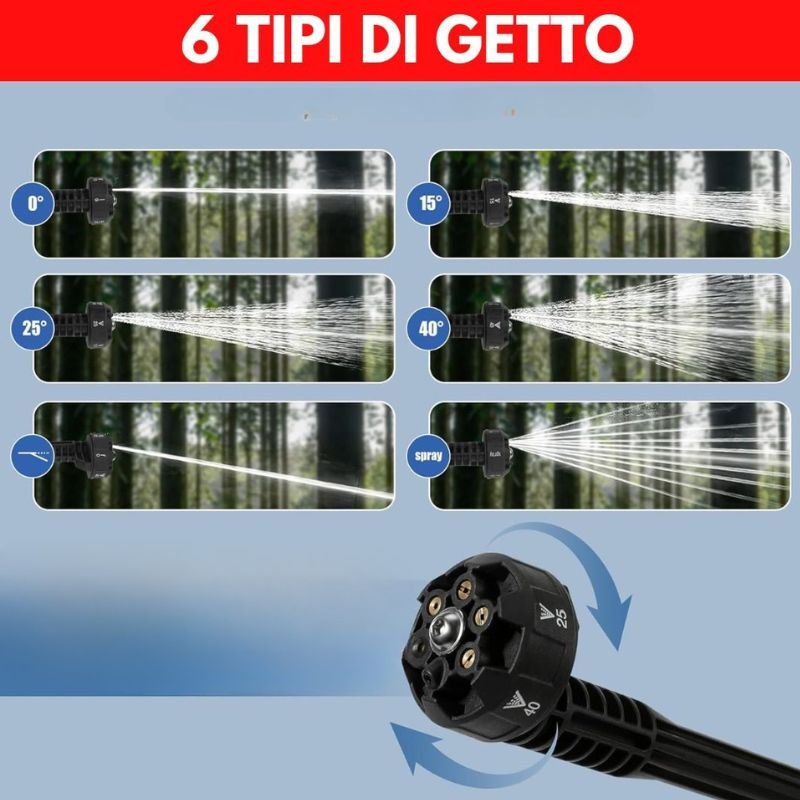 L’Idropulitrice Professionale Pro offre sei getti: zero gradi per sporco ostinato, quindici gradi per superfici esterne, venticinque gradi per veicoli, quaranta gradi per risciacqui delicati, spruzzo di schiuma per pulizie profonde e modalità pioggia per innaffiare o pulire delicatamente