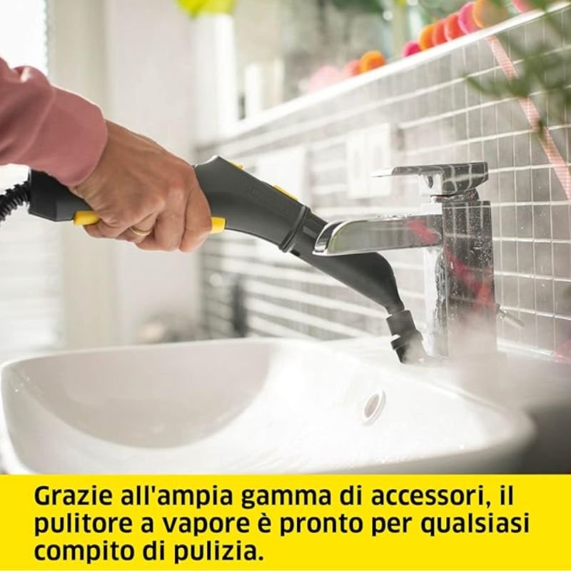 Dotato di 9 accessori, questo pulitore a vapore si adatta a ogni esigenza di pulizia, da pavimenti e vetri a tappezzeria e interni auto, facilitando la rimozione di sporco anche nelle zone più difficili