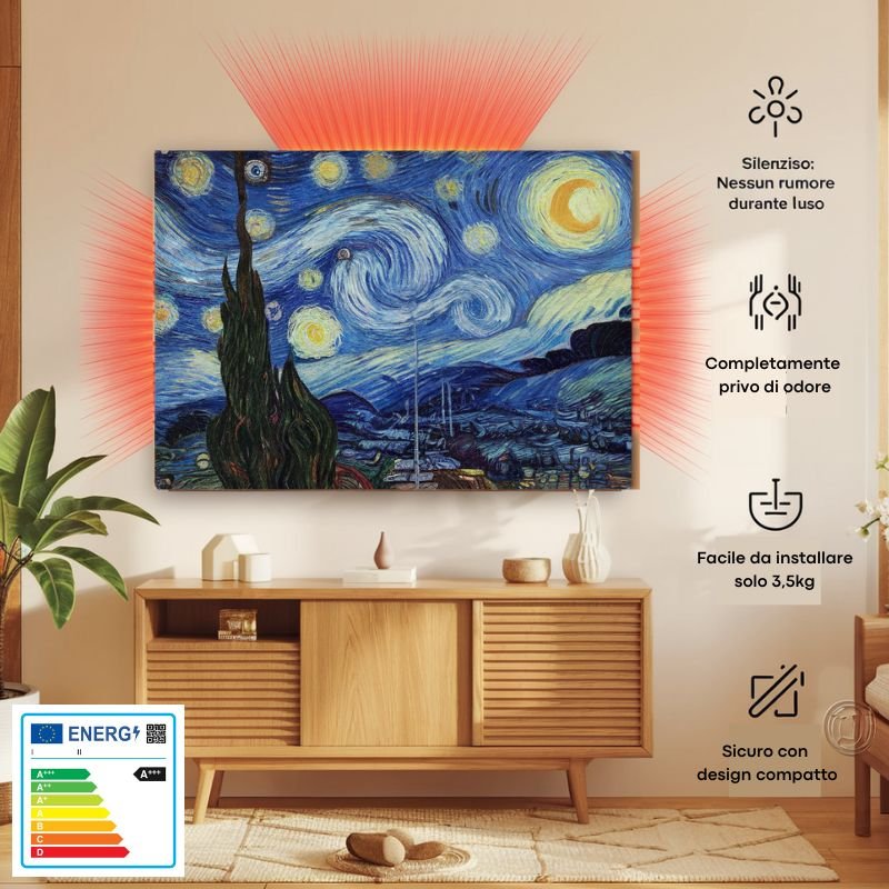 Riscalda la tua casa in modo naturale ed ecologico con il quadro termico a infrarossi, che riscalda fino a 3 stanze e può essere controllato tramite app per il massimo comfort e risparmio energetico